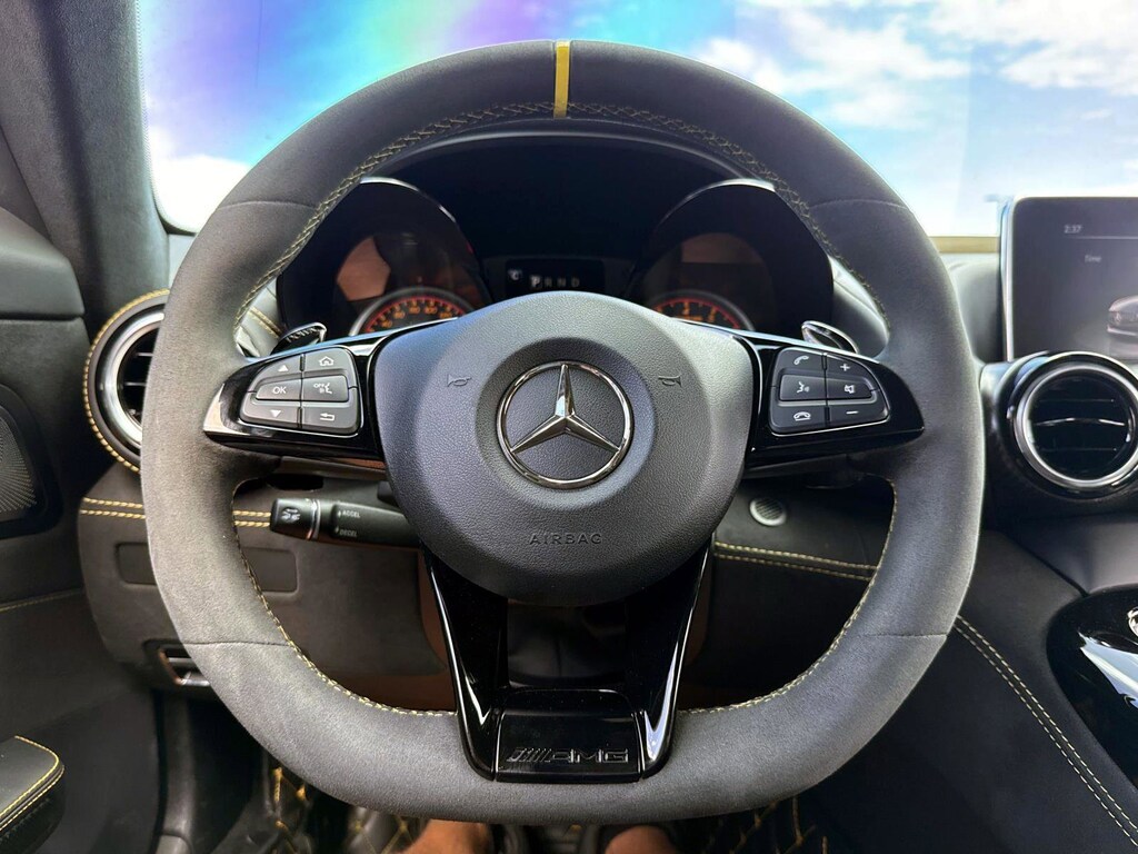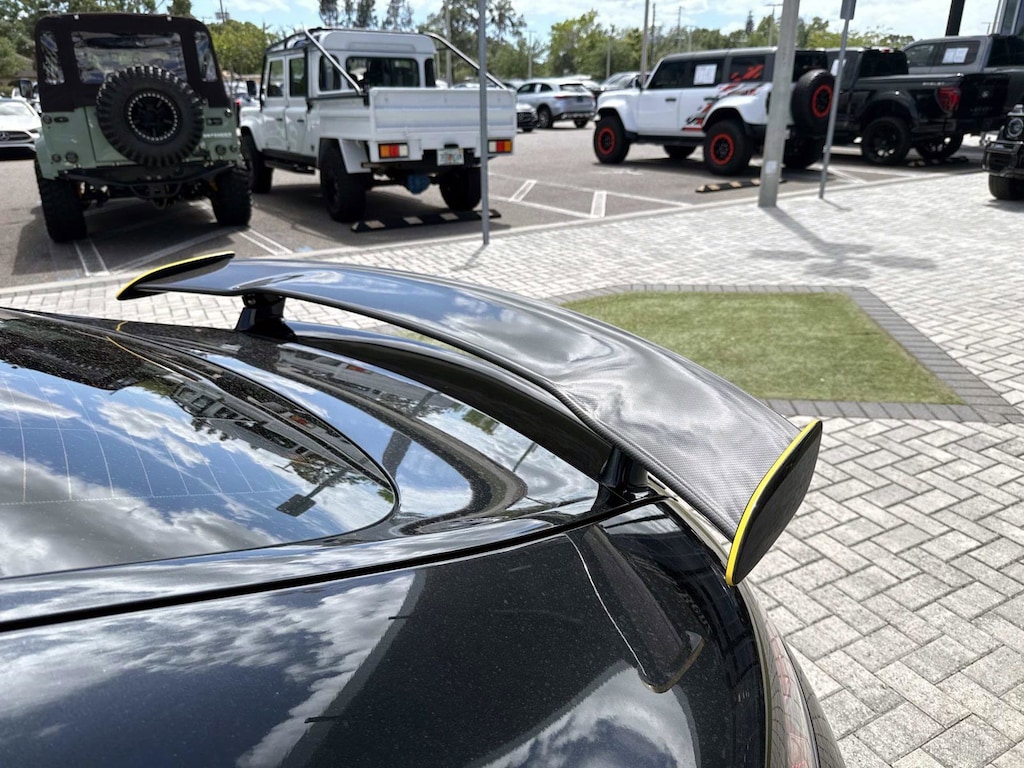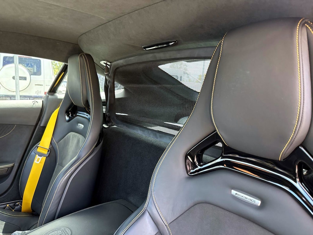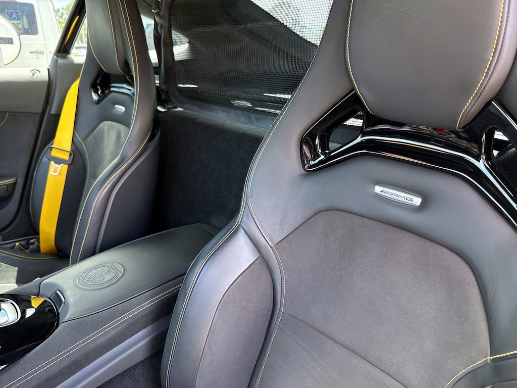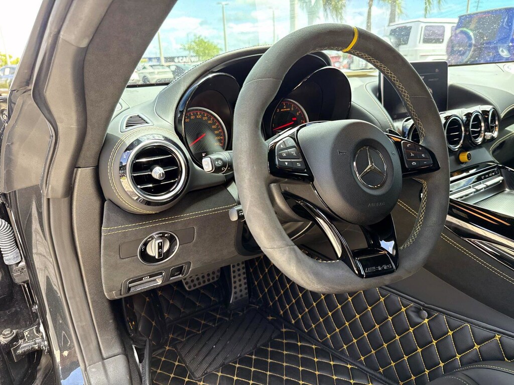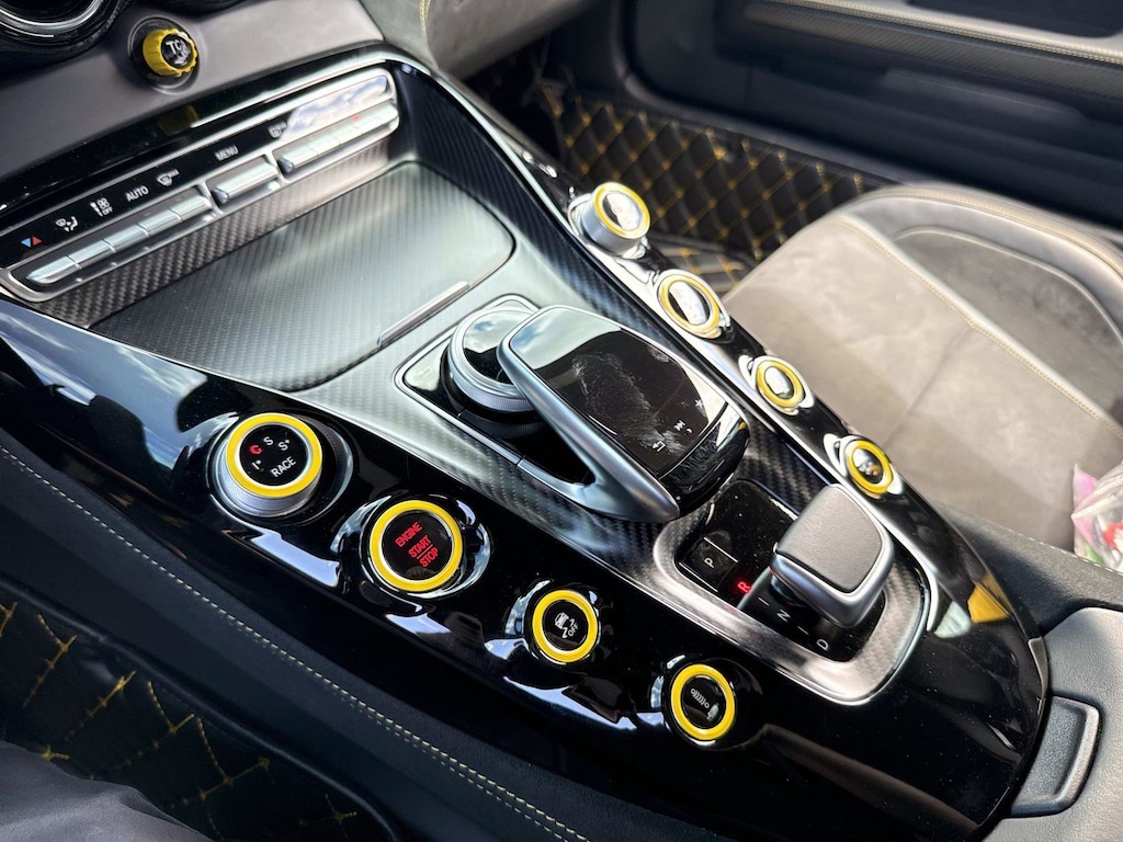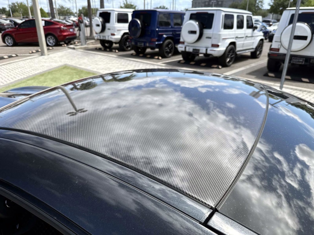 The car is finished in Magnetite Black Metallic with a carbon-fiber roof and yellow accents and was optioned with the AMG Exterior Carbon Fiber packages I and II, which added gloss black window trim in addition to a carbon-fiber front splitter, rear wing, rear diffuser, side vent fins, mirror caps, and side sill inserts. Additional features include carbon-fiber fenders, Parktronic, and LED headlights and taillights. Xpel clear paint protection film was applied to the nose in August 2021, and a rear bumper trim piece was replaced that same month.