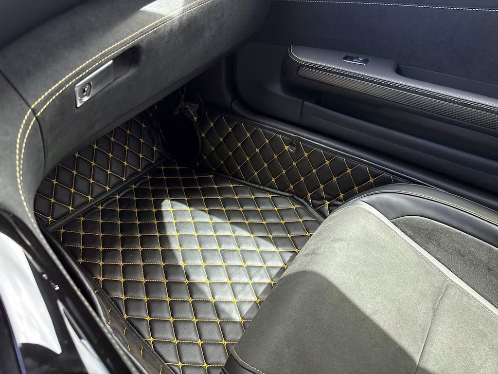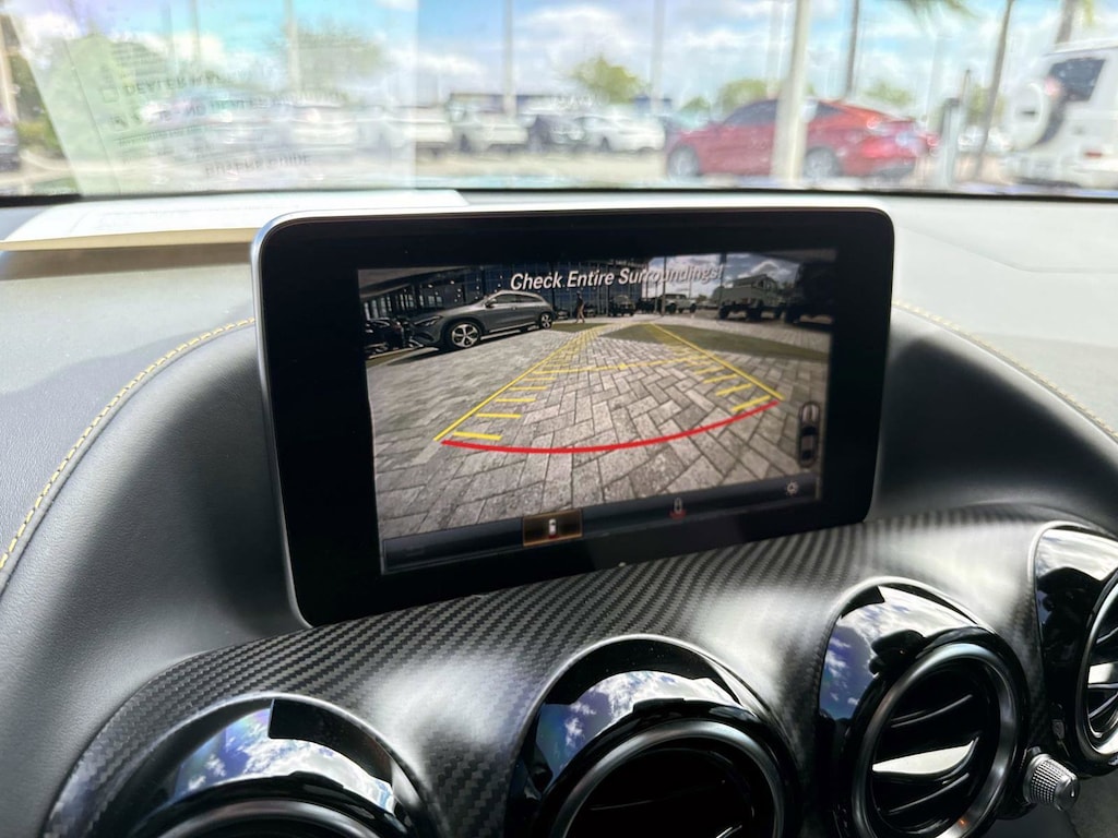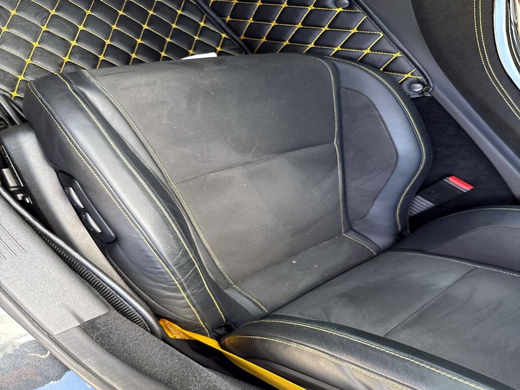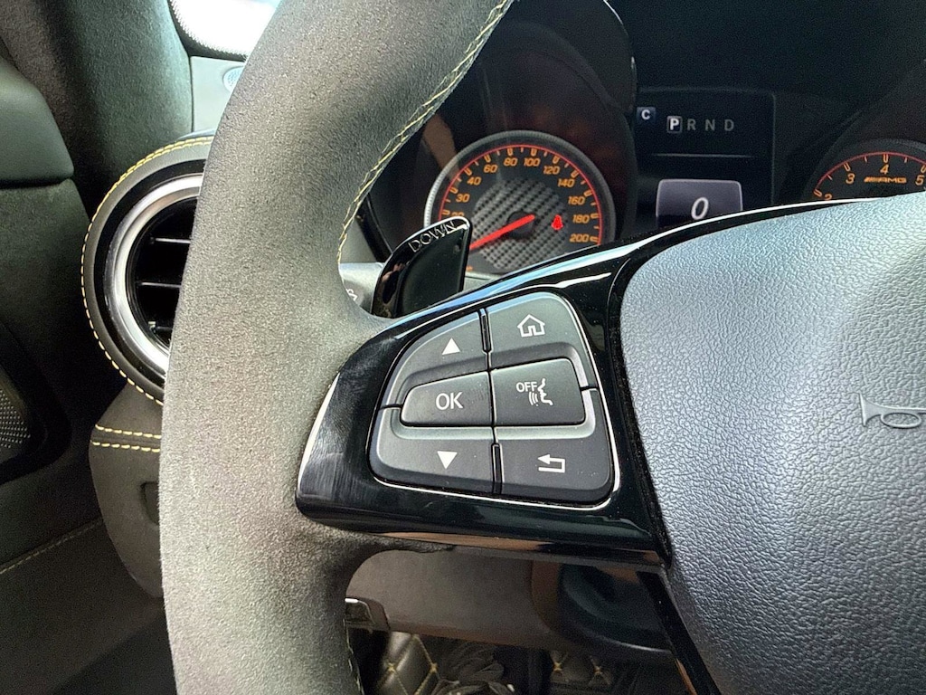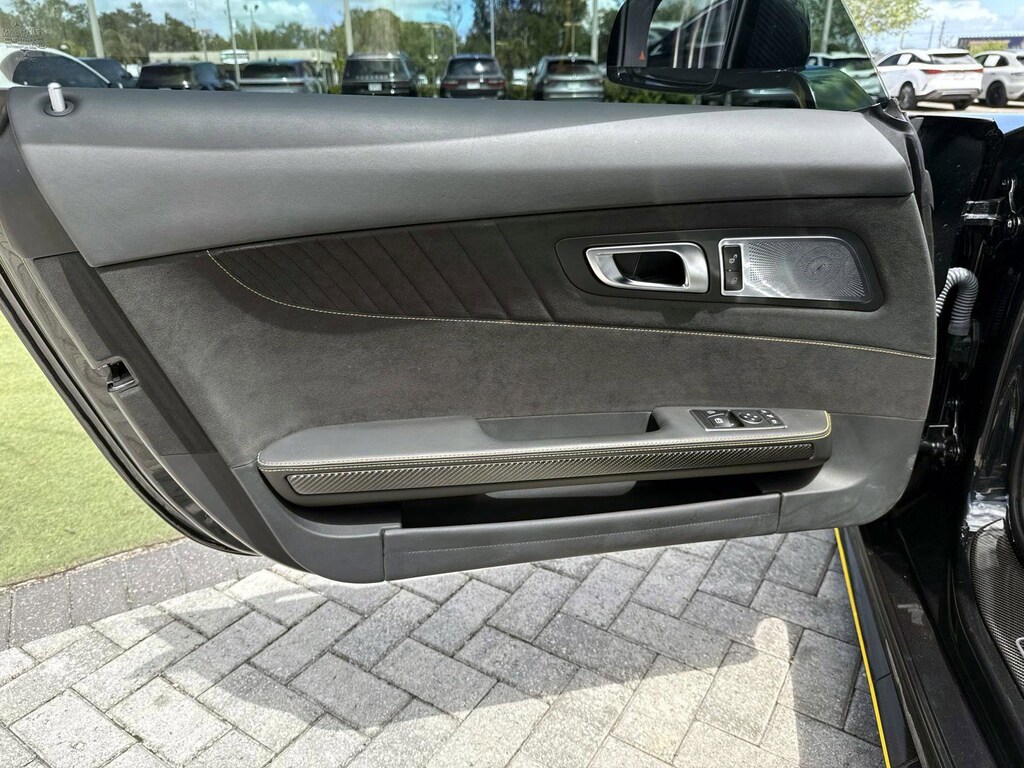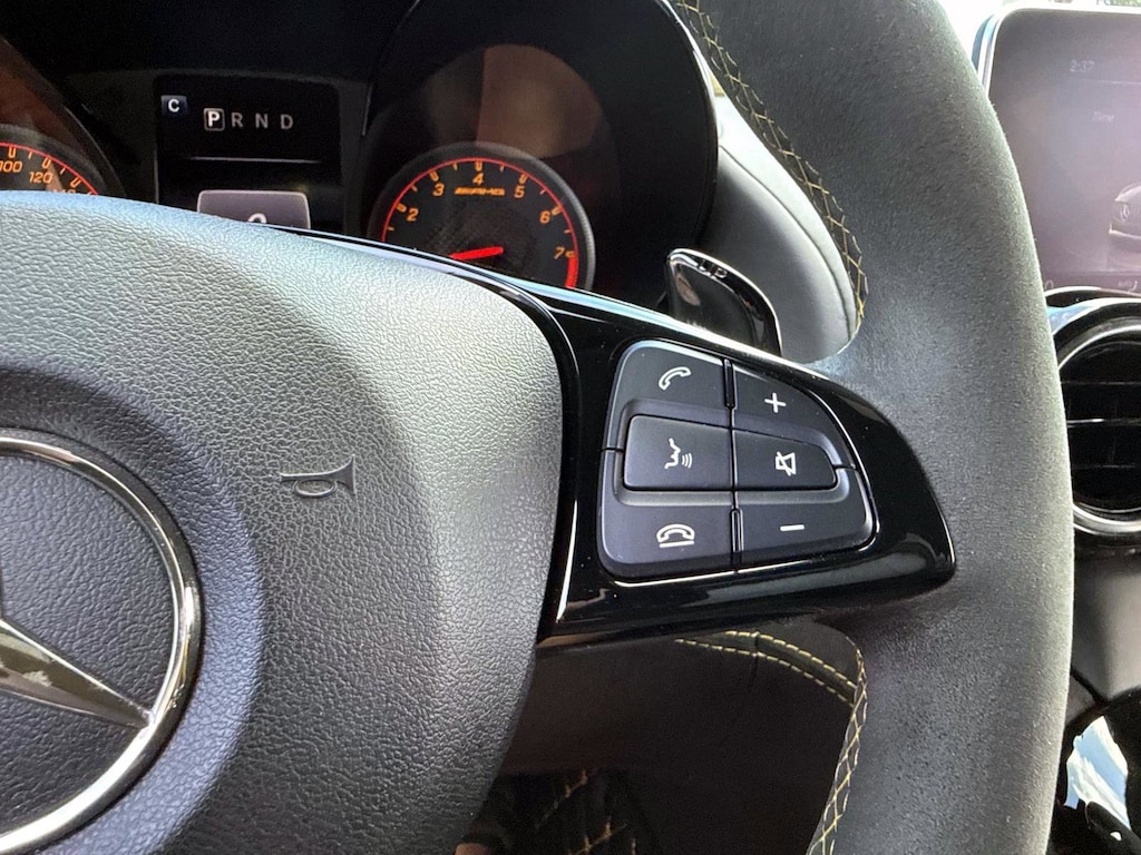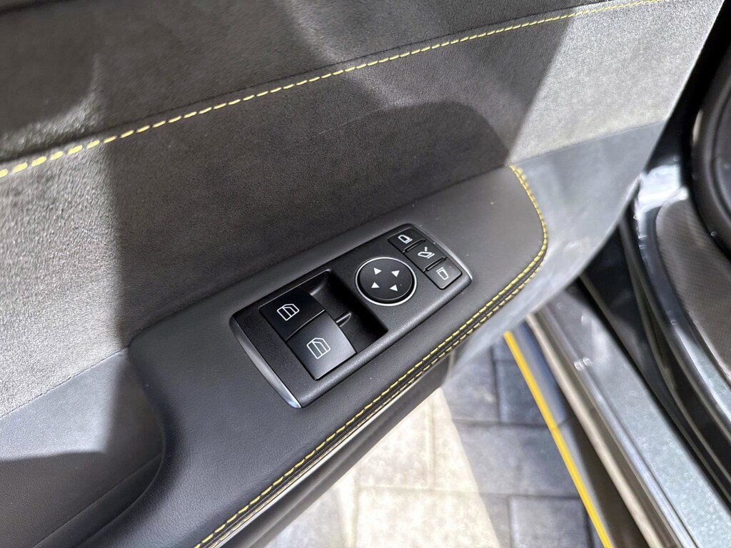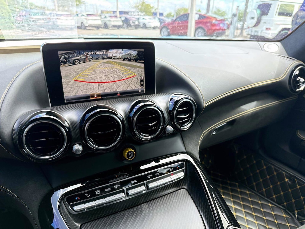 The car is finished in Magnetite Black Metallic with a carbon-fiber roof and yellow accents and was optioned with the AMG Exterior Carbon Fiber packages I and II, which added gloss black window trim in addition to a carbon-fiber front splitter, rear wing, rear diffuser, side vent fins, mirror caps, and side sill inserts. Additional features include carbon-fiber fenders, Parktronic, and LED headlights and taillights. Xpel clear paint protection film was applied to the nose in August 2021, and a rear bumper trim piece was replaced that same month.